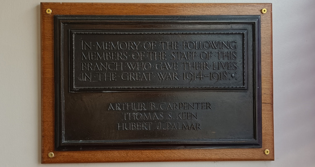 In memory of the following members of the staff of this branch who gave their lives in the Great War 1914-1918:
